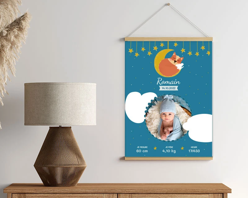 Notre affiche de naissance sur le thème du renard est un excellent choix de cadeau pour un petit garçon. Elle est personnalisable, de haute qualité et peut être livrée avec un cadre en bois blanc ou un porte-affiche magnétique en bois clair.