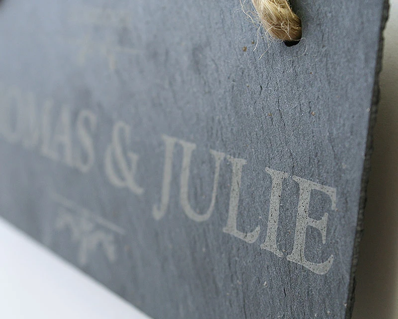 Ardoise naturelle découpée à la main suspendue par une corde rustique.