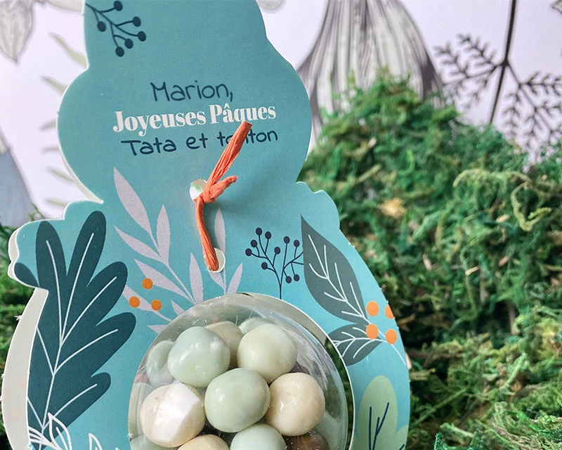 Ce petit lapin de Pâques en carton contient une boule remplie de céréales enrobées de chocolat qui ravira les papilles de tous les gourmands. Et ce n’est pas tout ! Vous pouvez personnaliser l’emballage avec un prénom et un message pour en faire un cadeau unique et personnel.