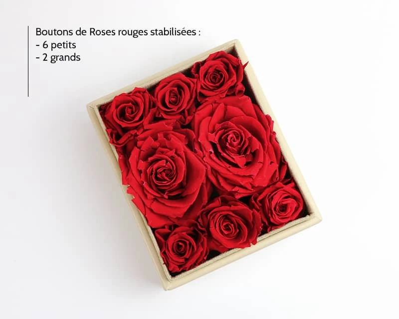 Lot de 8 boutons de roses rouges : 6 de petit format et 2 de grand format Leur jeunesse n’est pas éphémère, elles dureront des mois voire des années.