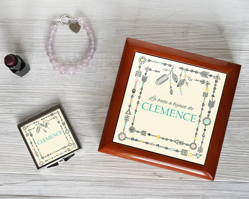 Cette boîte à bijoux et ce miroir personnalisés d’un prénom sont les cadeaux parfaits pour un anniversaire, la fête des mères, Noël ou toutes autres occasions. Son design Attrape-rêves hyper tendance vous accompagnera tout au long de la journée. Une idée cadeau qui fera plaisir à tous les coups. Parfait pour offrir à votre mère, votre soeur ou votre amie. Pensez aussi à ajouter la touche finale à votre cadeau : un pendentif orné de Cristaux Swarovski®. Un petit bijou qui ravira à tous les coups !