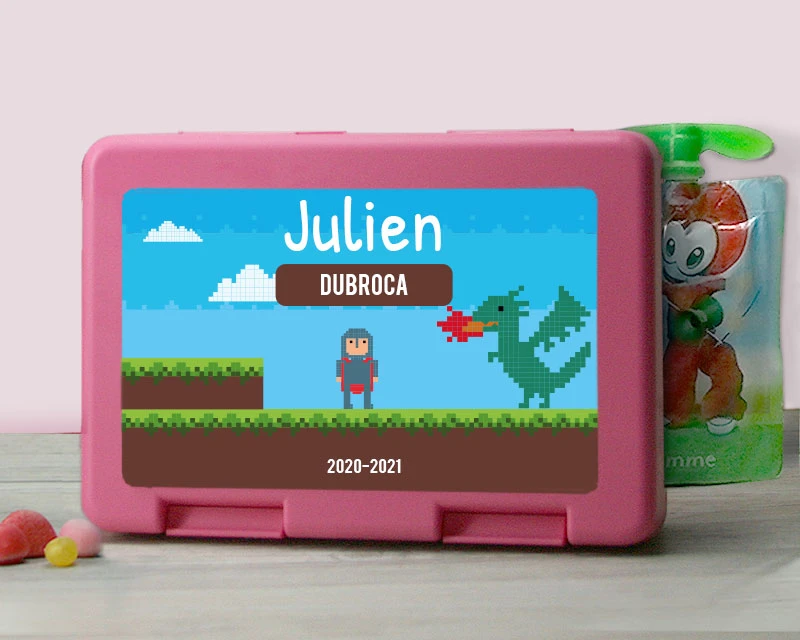 Elle est juste à la bonne taille pour contenir un goûter équilibré et reprendre des forces pendant la récréation ou une sortie scolaire, sans être lourde à porter. Son design de chevalier combattant le dragon des jeux vidéos de notre enfance lui ouvrira la porte à de nombreuses histoires d’aventures chevaleresques.