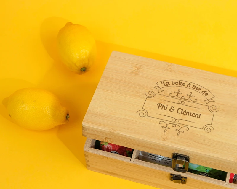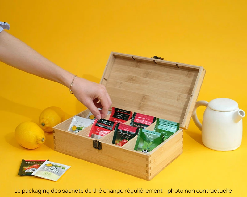 Notre boîte à thé en bois contient 8 compartiments pour vos sachets de thé ou tisanes.