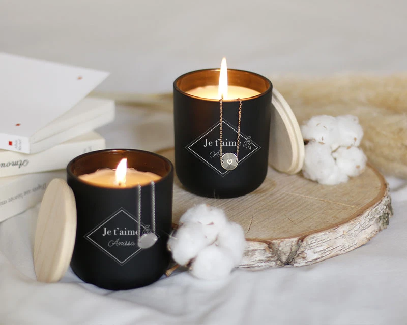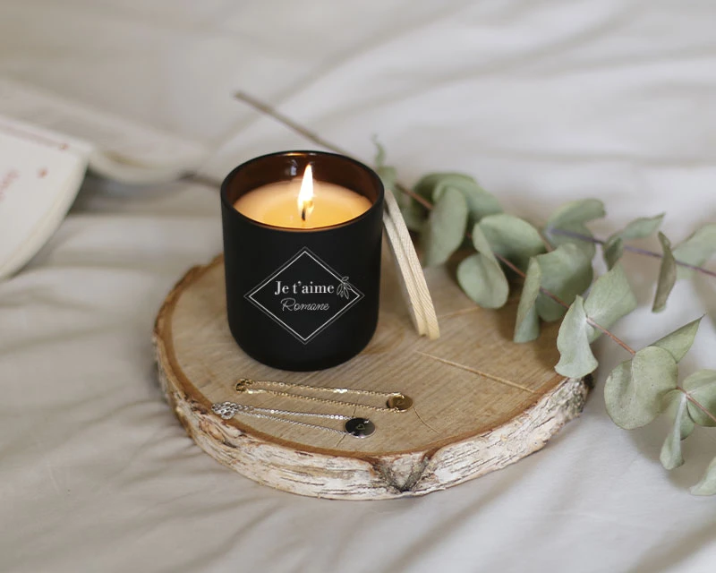 Ravivez la flamme avec cette bougie bijou personnalisée, un cadeau à la fois déco, cocooning et bijou. Cette élégante bougie noire gravée avec le petit mot de votre choix révèlera un joli bracelet médaille en argent ou plaqué or comme deuxième cadeau, lorsque sa cire au doux parfum de vanille se sera consumée.