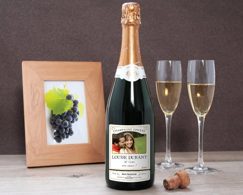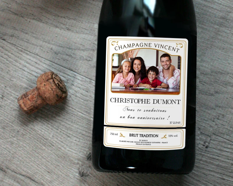 DĂ©couvrez un dĂ©licieux vin de Champagne brut produit par la Maison Vincent Père et Fils. La bouteille en verre est agrĂ©mentĂ©e d’une Ă©tiquette personnalisable. Ajoutez sur l’Ă©tiquette la photo de votre choix, en couleur ou en noir et blanc. Un texte personnalisĂ©, noir sur fond blanc, accompagne la photo pour une attention unique. ProposĂ©e en option, notre caisse Ă champagne en bois complète Ă merveille votre cadeau.