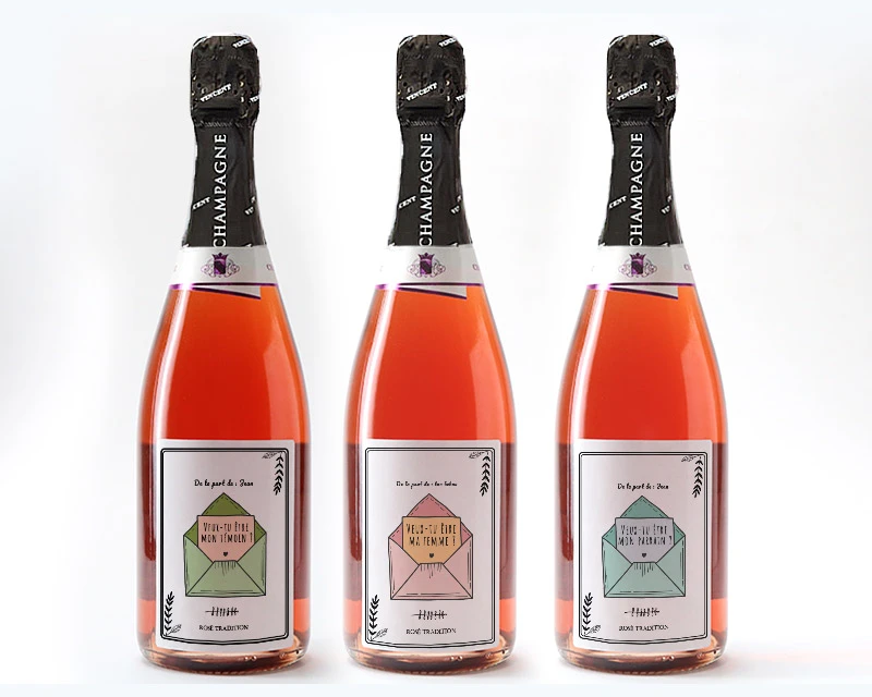 Le Champagne se destine à des occasions bien spéciales… votre déclaration aussi ! Si vous souhaitez demander à un proche d’être son témoin de mariage ou d’être le parrain ou la marraine de votre enfant, alors vous détenez le support idéal pour vous déclarer de façon originale. Vous pouvez même déclarer vos sentiments de cette manière le soir de la Saint-Valentin ! Son ou sa destinataire gardera en souvenir cette bouteille de nombreuses années durant.