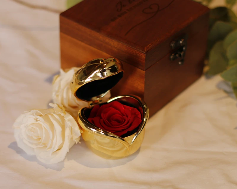 Touchez votre cible en plein cœur avec notre coffret en bois contenant une rose éternelle à l’intérieur d’un écrin doré. L’émotion sera au rendez-vous à l’occasion de votre anniversaire de mariage.