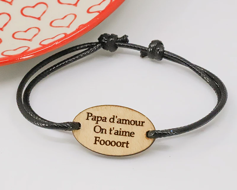 Soyez sûr(e) de faire plaisir en offrant ce bracelet en cordon avec médaille ovale en bois personnalisable ! Un cadeau original et unique qui fera craquer tous les papas à la prochaine Fête des Pères, et qui raviront tous les chéris à la Saint Valentin.