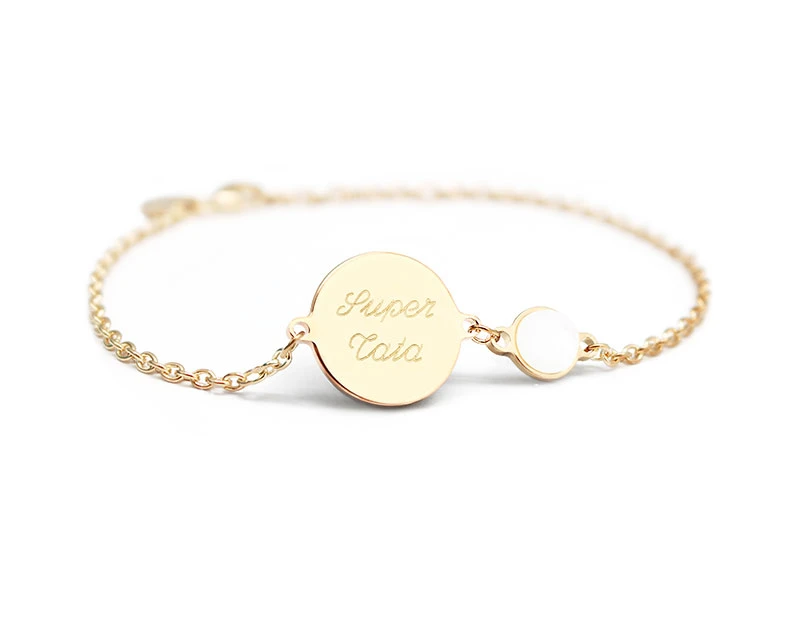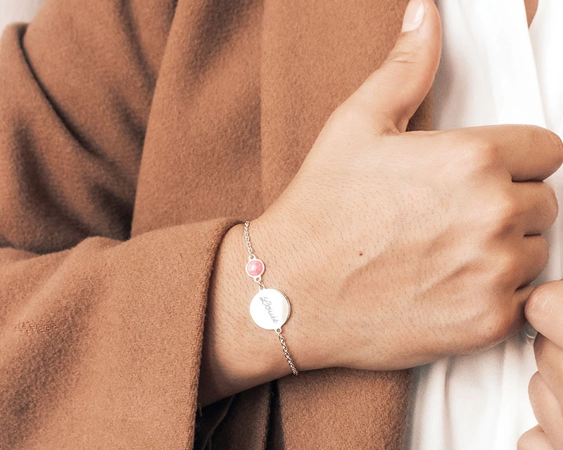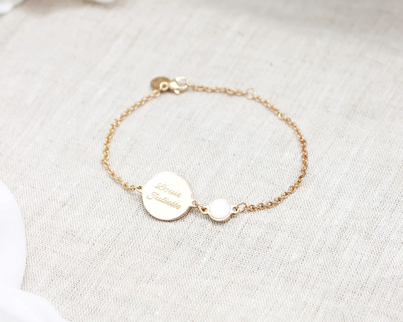 Pour plus de gaité et de chic, nous y avons associé une délicate pierre fine rose en rhodochrosite sertie sur la version argent 925, et une nacre blanche sertie sur la version plaqué or. Personnalisez votre bracelet par une gravure qui a du sens afin de rendre ce bijou unique.
