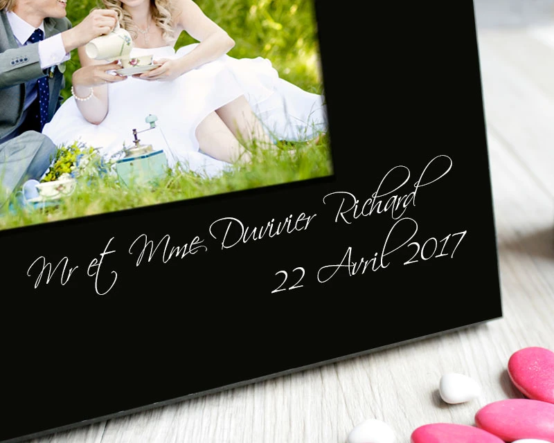 Le cadeau idéal pour le couple parfait ! Offrez ce cadre personnalisé aux jeunes mariés le jour de leur mariage ou pour célébrez leurs années passées ensemble lors de leur anniversaire ! Faites graver leur deux prénoms l’un à côté de l’autre ainsi qu’un petit message ou tout simplement la date de cet heureux événement !