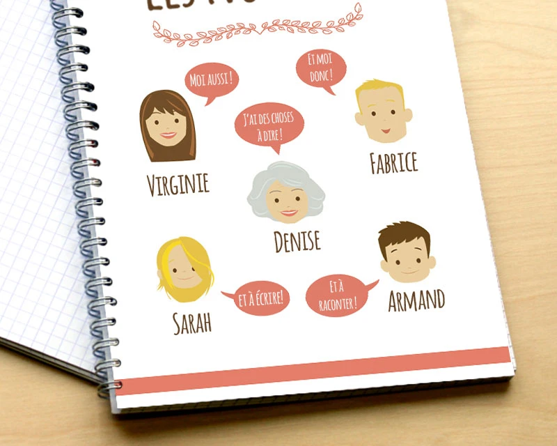 Vous avez toujours beaucoup de choses à dire ? Notez-les sur ce cahier pour ne jamais rien oublier ! Personnalisez-le avec les personnages des membres de votre famille pour un cahier vraiment unique !
