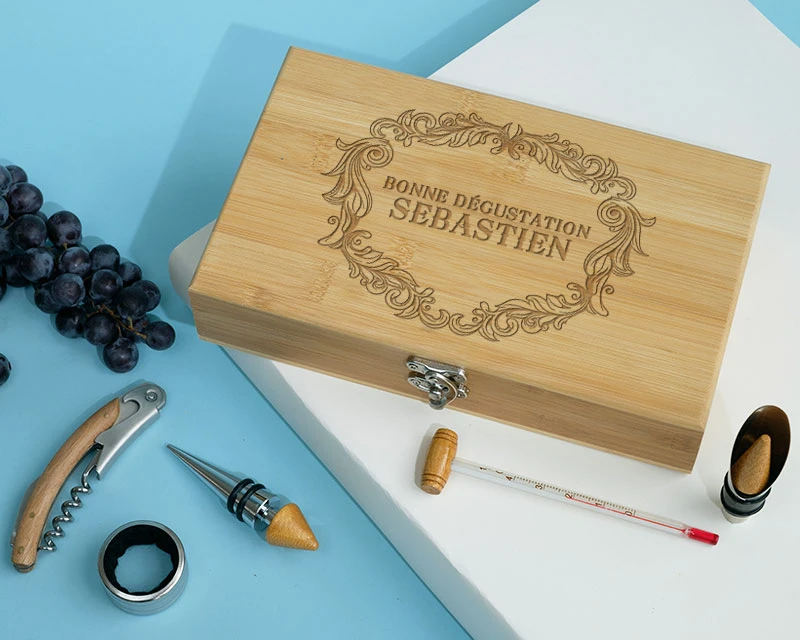 Notre coffret du sommelier personnalisable constitue le cadeau idéal pour tous les amateurs de vin. Ce set est présenté dans une jolie boîte en bambou gravée du texte « Bonne dégustation ». Elle renferme les accessoires indispensables du parfait sommelier. Pour personnaliser ce cadeau, pensez à nous indiquer le prénom de son heureux destinataire. Vous pouvez également le compléter avec la bouteille de vin de votre choix.