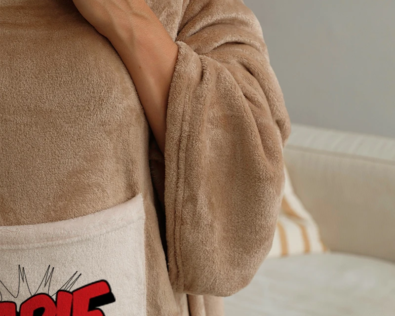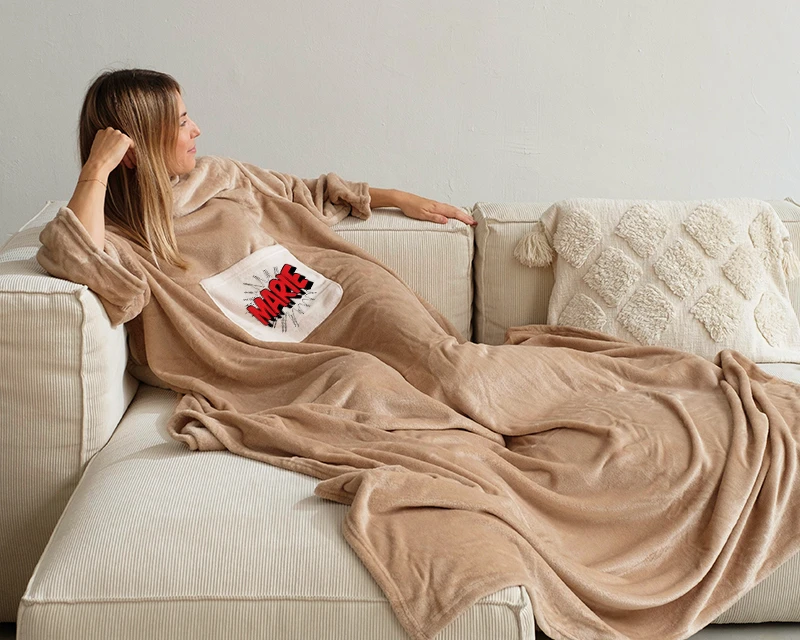 Équipée d’une poche pour y placer votre télécommande ou votre téléphone, cette couverture à manches couvrira l’intégralité de votre corps grâce à ses dimensions de 210 x 152 cm au total !