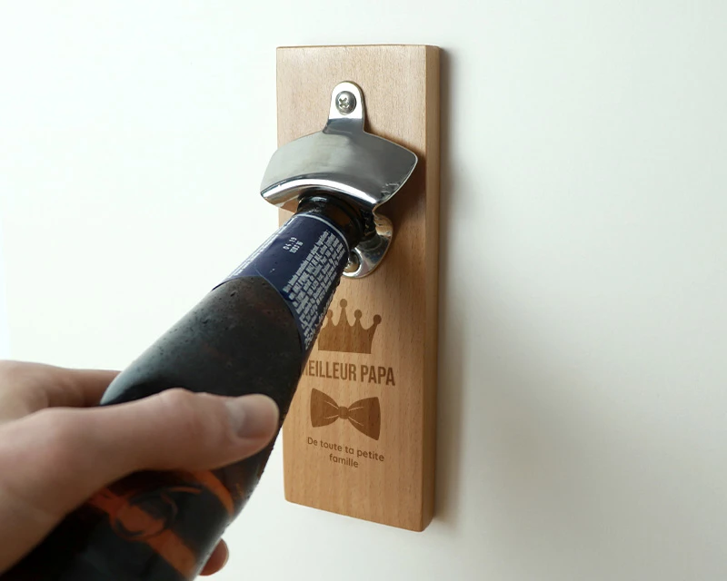 Avec son support en bois massif à fixer grâce à un système adhésif, plus besoin de percer pour accrocher ce décapsuleur mural à personnaliser. Il conviendra donc également aux papas les moins bricoleurs ou aux papas qui louent le logement familial. Et puis, de toute façon, hors de question d’attendre trop longtemps pour boire cette bonne mousse fraîche, n’est-ce pas ?