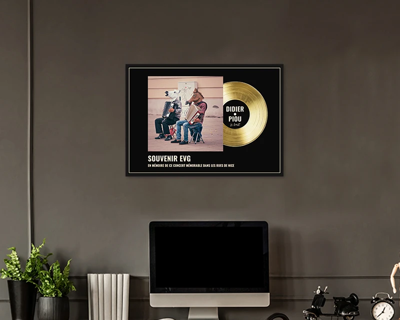 Notre disque d’or personnalisé se constitue d’une affiche vinyle sur un fond noir et d’une photo faisant office de pochette. Le tout est inséré dans un cadre en bois. Le design de cet objet personnalisable rappelle celui des disques des icônes de la pop music. Vous pouvez ajouter le texte de votre choix pour obtenir un cadeau unique (prénom, titre d’un album, musique préférée, etc.).