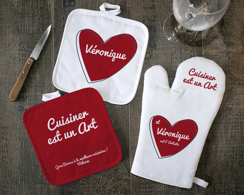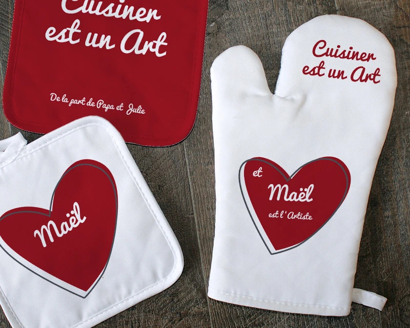 Cuisiner est un art qui flatte les papilles et les pupilles et qui nourrit les cœurs. Mais qui est donc l’artiste de votre entourage qui manie cet art comme personne ? Est-ce votre mamie qui vous concocte de bons petits plats familiaux depuis votre enfance ? Est-ce votre meilleur ami qui s’entraîne pour la prochaine saison de Top Chef ? Est-ce votre oncle qui met toujours les petits plats dans les grands lorsqu’il reçoit ? Ou bien est-ce tout simplement votre papa ou votre maman qui n’ont eu de cesse de bien vous nourrir tout au long de votre vie ? Pour tous ces artistes de la cuisine, et pour ceux en devenir, cet ensemble gant et maniques personnalisés leur rendra hommage de manière originale pour leur cadeau d’anniversaire, de Noël, ou n’importe quelle autre fête.