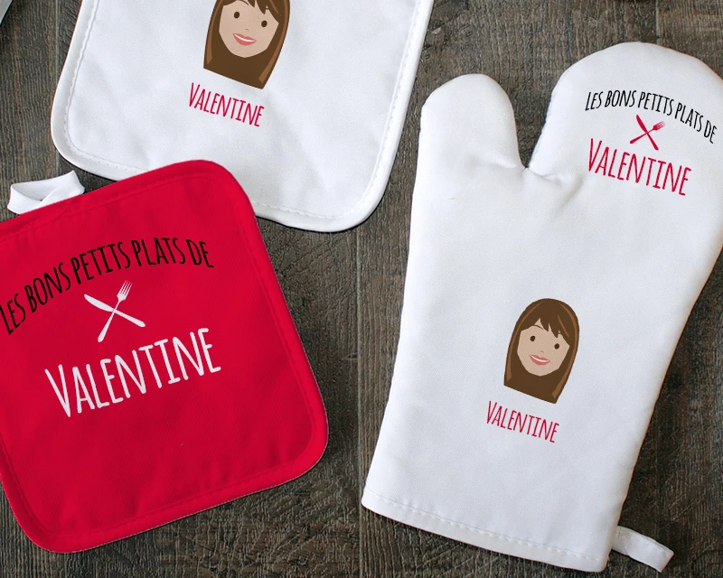 Comme il y a les adeptes du gant de cuisine, les adeptes des maniques et ceux qui aiment mixer, ce lot, qui comprend un gant et deux maniques personnalisés, mettra tout le monde d’accord. Et avec leur illustration adorable, ces trois pièces permettront également d’égayer la déco de la cuisine.