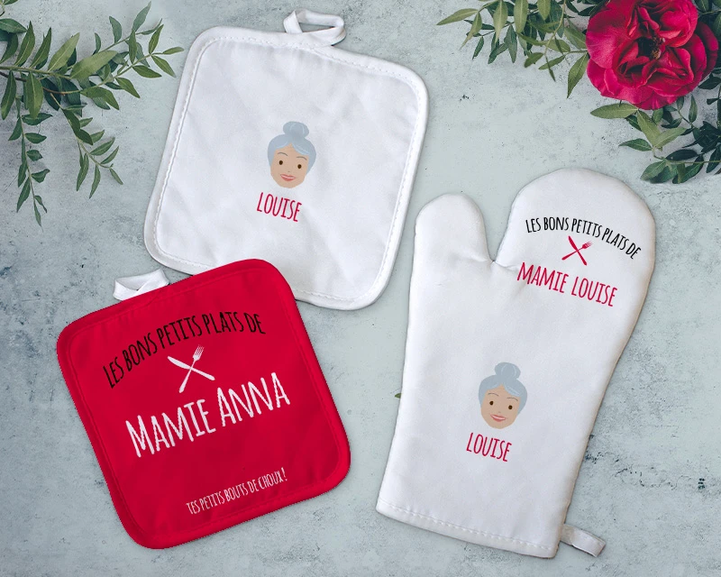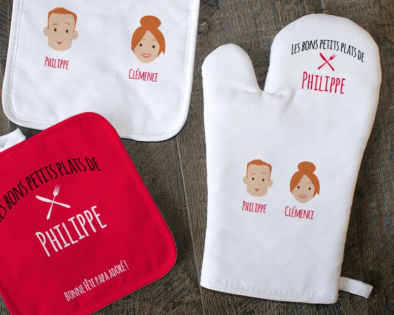 Ce joli lot est un indispensable pour n’importe quel cuistot, afin d’attraper un plat qui sort du four sans se brûler, ou comme dessous de plat éphémère. La personnalisation avec le prénom et la trombine dessinée des parents ou des grands-parents et des enfants ou petits-enfants, associée à un petit message, en fait un cadeau à la fois touchant et original qui ne laissera personne indifférent.