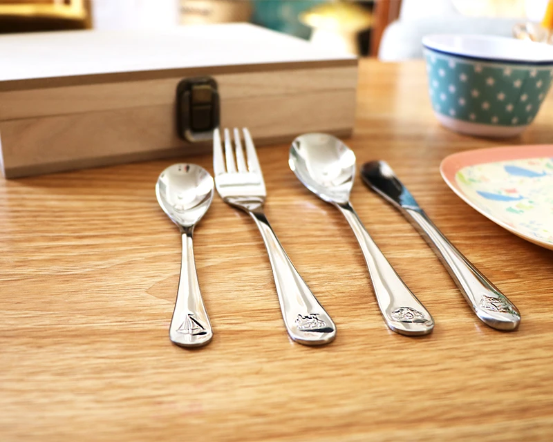 Pour chaque naissance, un cadeau de bienvenu est une tradition des plus anciennes ! Et si vous offriez un set de couverts personnalisé de table pour enfant ? Ce set comprenant une fourchette, une cuillère à soupe, un couteau et petite cuillère sont délicatement rangés dans cette jolie boîte en bois, vous la rendrez unique, comme l’enfant nouveau né, avec un message personnel et son prénom. Ainsi elle fera un magnifique souvenir à conserver. Son design tendre et épuré en fait un excellent choix que cela pour une petite fille que pour un petit garçon.