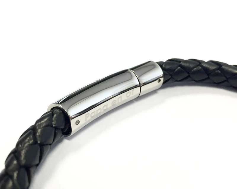 L’association du cuir et de l’acier de ce bracelet gravé homme rehausse tous les looks, du plus casual au plus chic, ce qui en fait un indispensable de tous les dressings masculins. Et Monsieur ne manquera pas une occasion de le porter, grâce à son fermoir magnétique ultra-pratique.