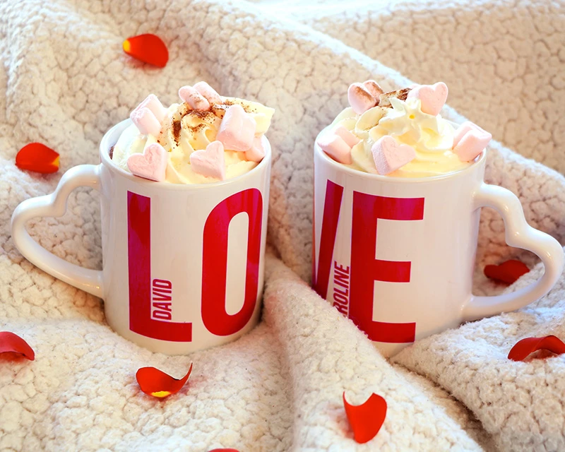 Parfait pour les amoureux, ce duo de mugs avec des anses coeurs forme le mot LOVE ! Ajoutez vos prénoms pour une ambiance très romantique dès le petit déjeuner… Un cadeau entièrement personnalisé ! Partagez ensemble votre café du matin avec douceur et amour.