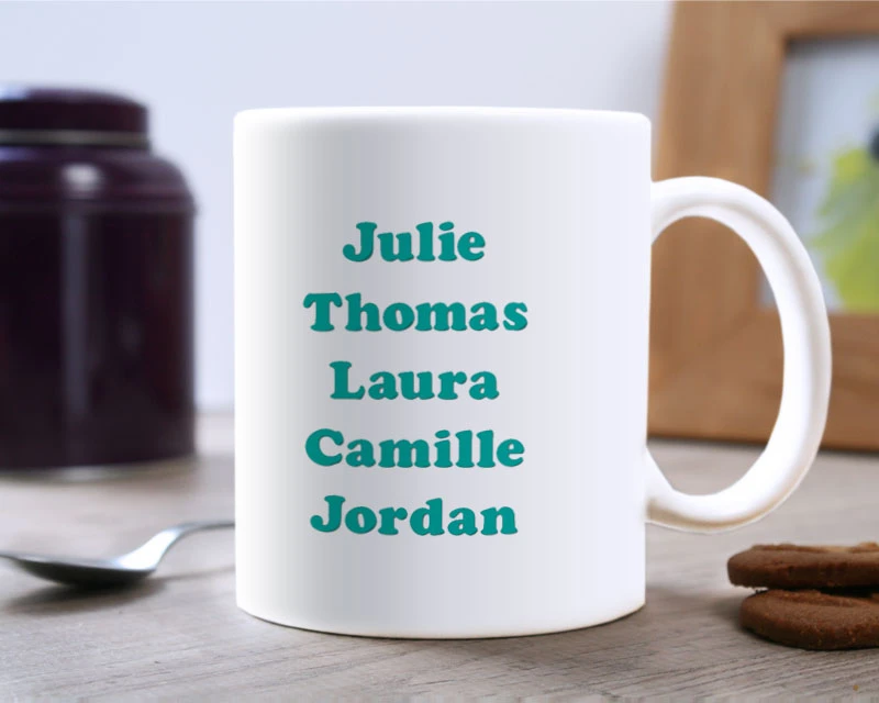 Mais cette tasse mug personnalisée n’est pas réservée uniquement aux familles de sang. Toutes les familles de cœur ont également droit à cet adorable mug, comme votre groupe d’ami.e.s inséparables, votre groupe de musique ou votre association de bénévoles. Et pour encore plus de rires et d’émotions, n’hésitez pas à troquer le prénom de chacun contre leurs surnoms. Bien sûr, vous pouvez également détourner cette tasse personnalisable comme cadeau de Saint-Valentin original, en y inscrivant le prénom des deux tourtereaux. Ou bien, offrez ce mug à un ami à l’égo surdimensionné, en ne sélectionnant que son prénom pour la personnalisation. Fou rire garanti !