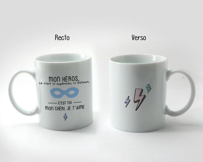 Quand bien même la force de Superman et Batman, les plus grands héros sont ceux qui forgent notre quotidien. Nous avons tous un super héros dans notre cœur, que l’on admire jour après jour. Qui est ce héros pour vous ? Votre papa ? Votre amoureux ? Votre grand-père ? Au nom de cet homme que vous admirez tant, voici un mug qui lui est dédié ! A vous de personnaliser la dernière ligne. Chaque héros mérite d’avoir son propre mug, pensez y pour un anniversaire, la Fête des Pères ou encore à Noël.