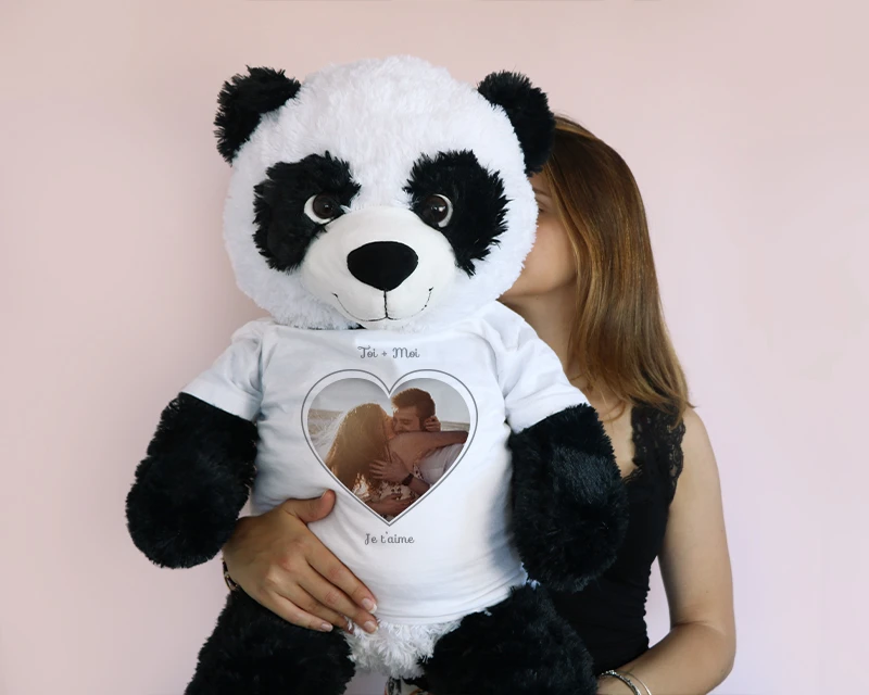 Personne ne peut résister à autant de douceur ! Avec son t-shirt personnalisé, ce panda géant deviendra le meilleur compagnon de son destinataire. Avec sa photo personnalisable, il est le cadeau parfait à offrir à l’être aimé pour la St Valentin. Dans le lit pour des câlins ou en déco dans votre intérieur, il trouvera forcément une place de choix !