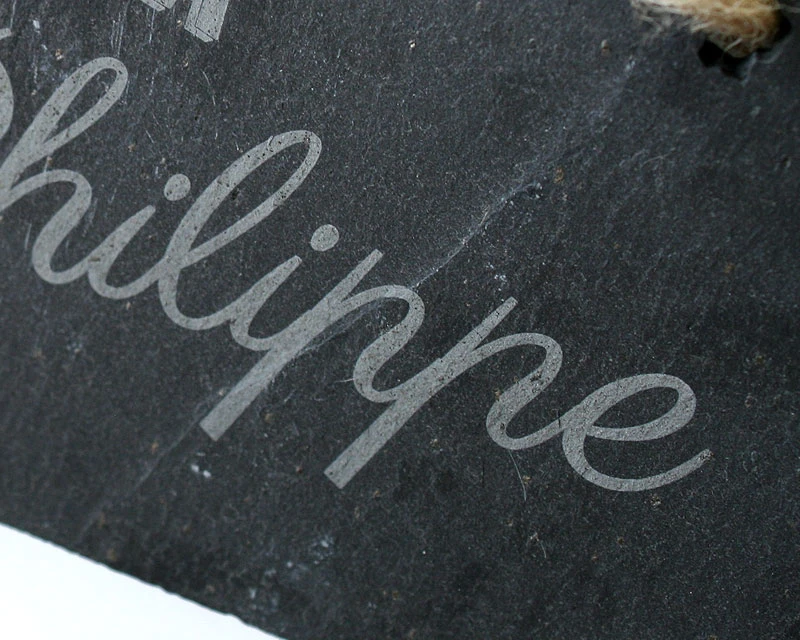 Ardoise naturelle découpée à la main suspendue par une corde rustique.