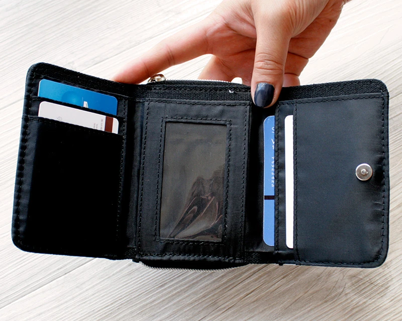 L’intérieur est équipé de 4 compartiments à cartes, 1 compartiment pour billets et un porte-monnaie avec fermeture éclair.