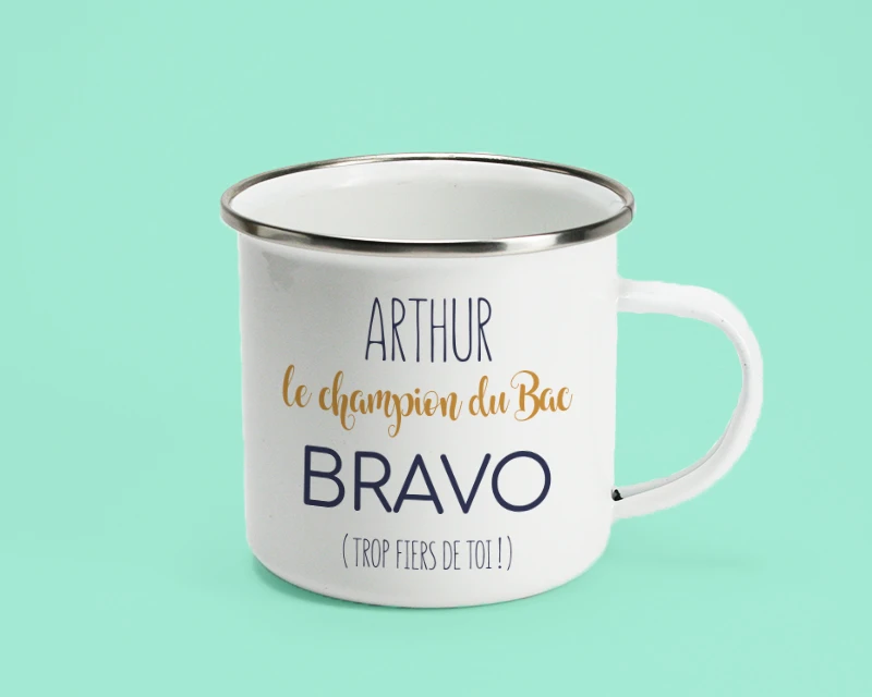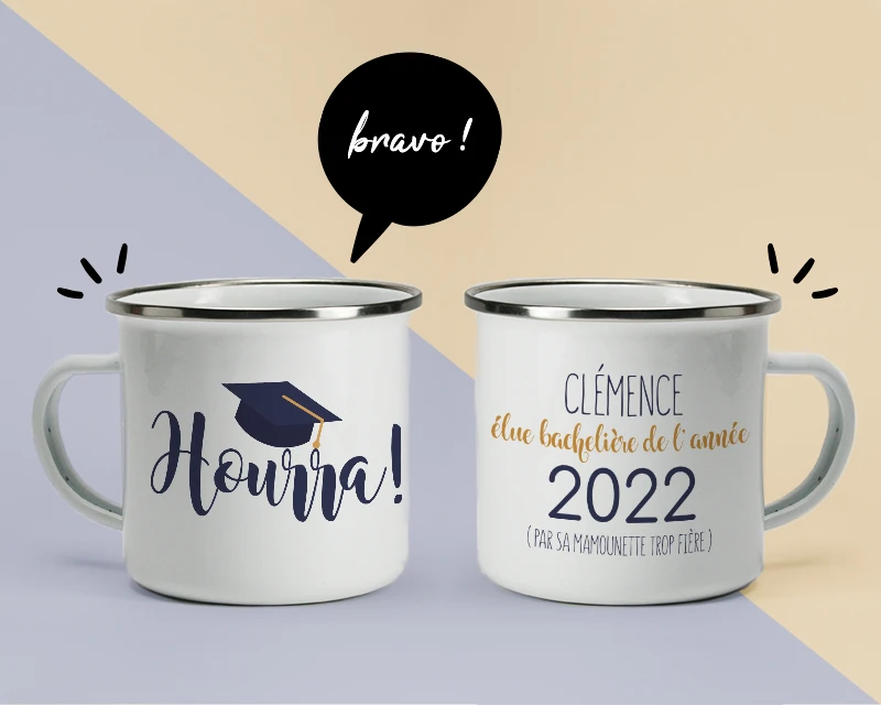 Houra ! Votre enfant, petit enfant, nièce ou neveu a obtenu son BAC avec brio et vous souhaitez marquer le coup avec un cadeau unique ? Ou peut-être est-ce même un diplôme de grandes études ? Ce mug émaillé personnalisable aux allures épurées et tendances saura lui faire plaisir et l’accompagnera peut-être dans de nouveaux challenges à venir ! Un joli souvenir de cette épreuve tant attendue et éprouvante qu’il ou elle aura réussi haut la main. Faites inscrire sur ce mug son prénom, la date d’obtention du fameux diplôme ainsi qu’un message positif ou de félicitations. Montrez-lui à quel point vous êtes très fière ou fier de cette réussite !