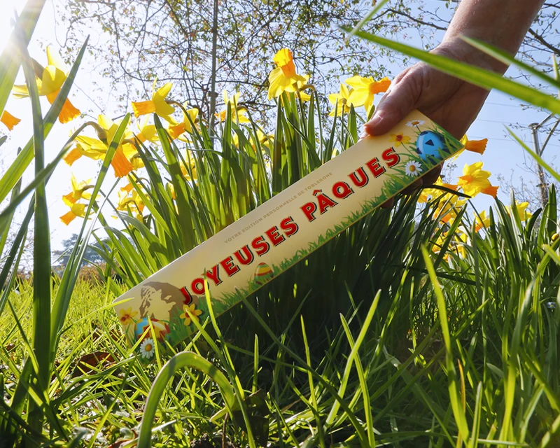 Barre géante de chocolat issue des ateliers de la célébre marque Toblerone et son emballage Joyeuses Pâques.