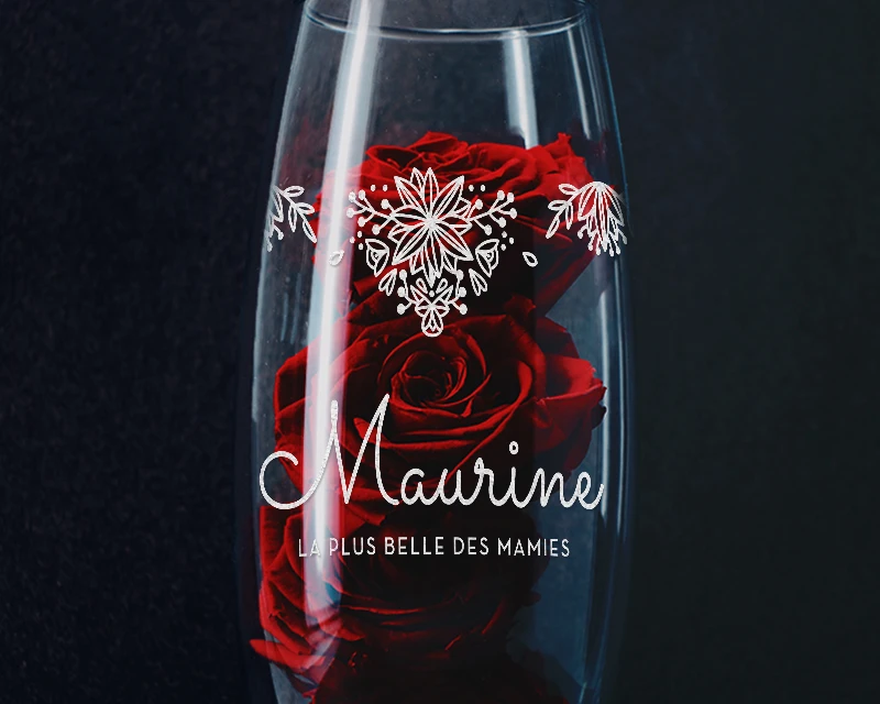 En quête d’un cadeau pour la fête des mères ? Les boutons de roses éternelles de notre vase en verre personnalisé raviront votre maman.